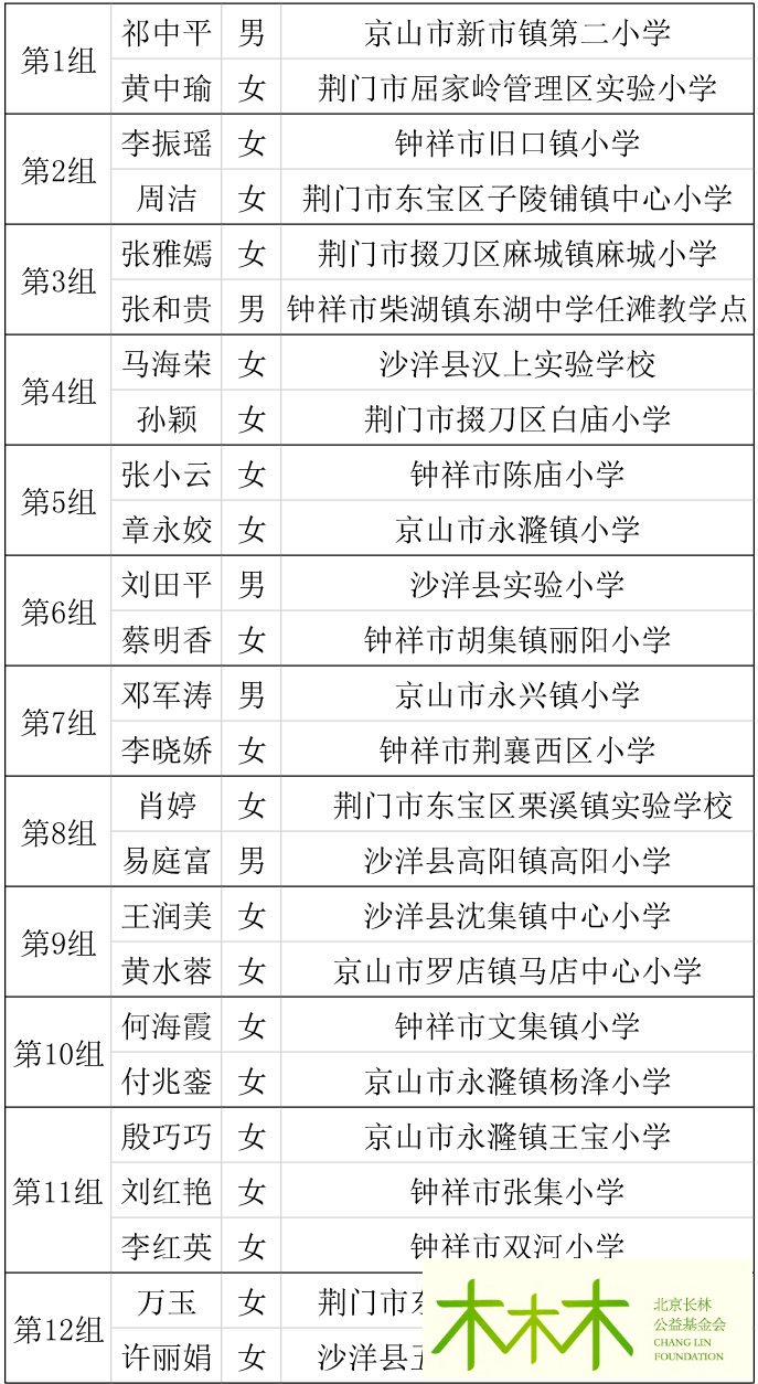 本着公平公正的原则,北京长林公益基金会根据各位老师在荆门班期间的表现,在每组内评选出了两名表现优异的教师参加本届家乡教师研修班的下一阶段,即北京班;因第11组为优胜小组,该组评选出了三名表现优异的教师。另外,北京长林公益基金会从研修班结束后各位老师发送的反馈中挑选出了4位老师的优秀感悟,这四位老师也将成为本届北京班的学员。